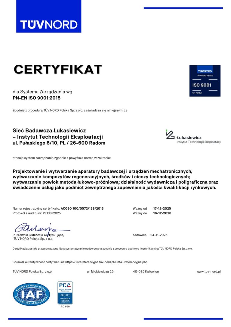 Sieć Badawcza Łukasiewicz – Instytut Technologii Eksploatacji, na podstawie decyzji Ministra Edukacji i Nauki z dnia 22 sierpnia 2023 roku (DSKKZ-WZSK.0754.6.2023.KP),pełni funkcję podmiotu zewnętrznego zapewniania jakości wobec instytucji certyfikujących kwalifikacje wolnorynkowe w następujących grupach:
